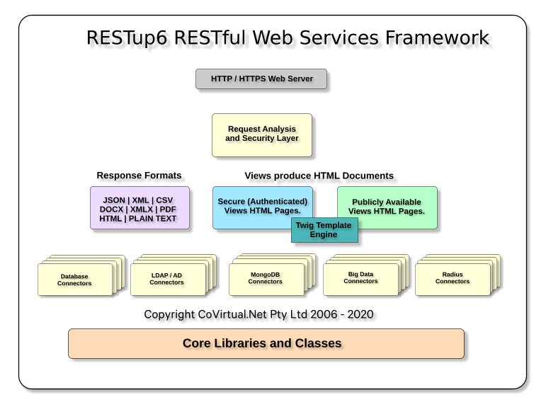 The RESTup6 RESTful Web Applications Framework, developed by CoVirtual.Net in Australia, facilitates rapid development of both Web Sites and Systems applications, via a RESTful web services interface, with connectors available for popular Relational and NO-SQL Databases, LDAP Directory Services, CSV, TSV, JSON and XML data structures.
